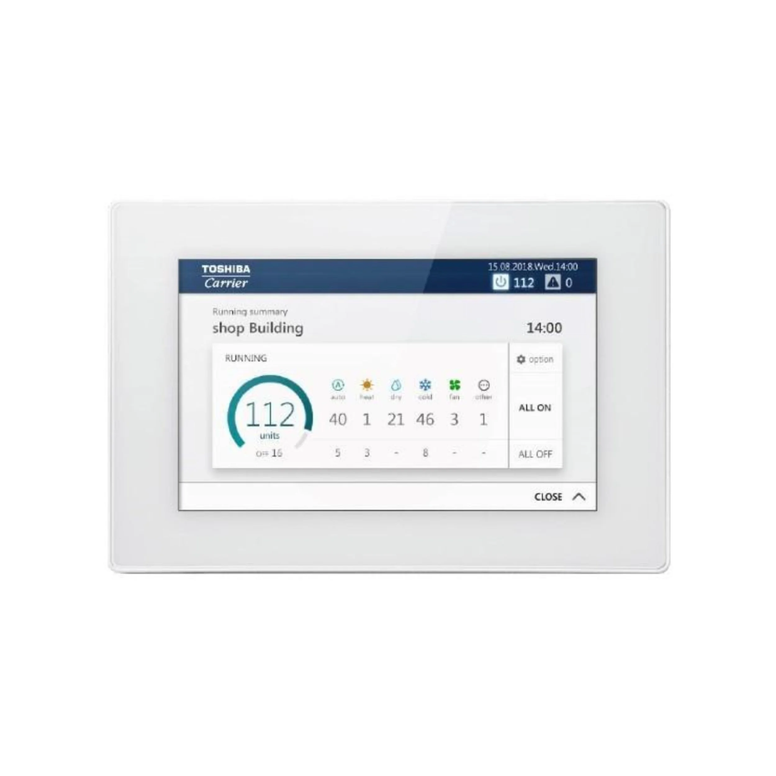 The Touch Screen Central Controller is a line voltage controller mounted on the wall with a touch screen LCD display panel. This controller enables the customer to control and monitor the operation of the VRF System.