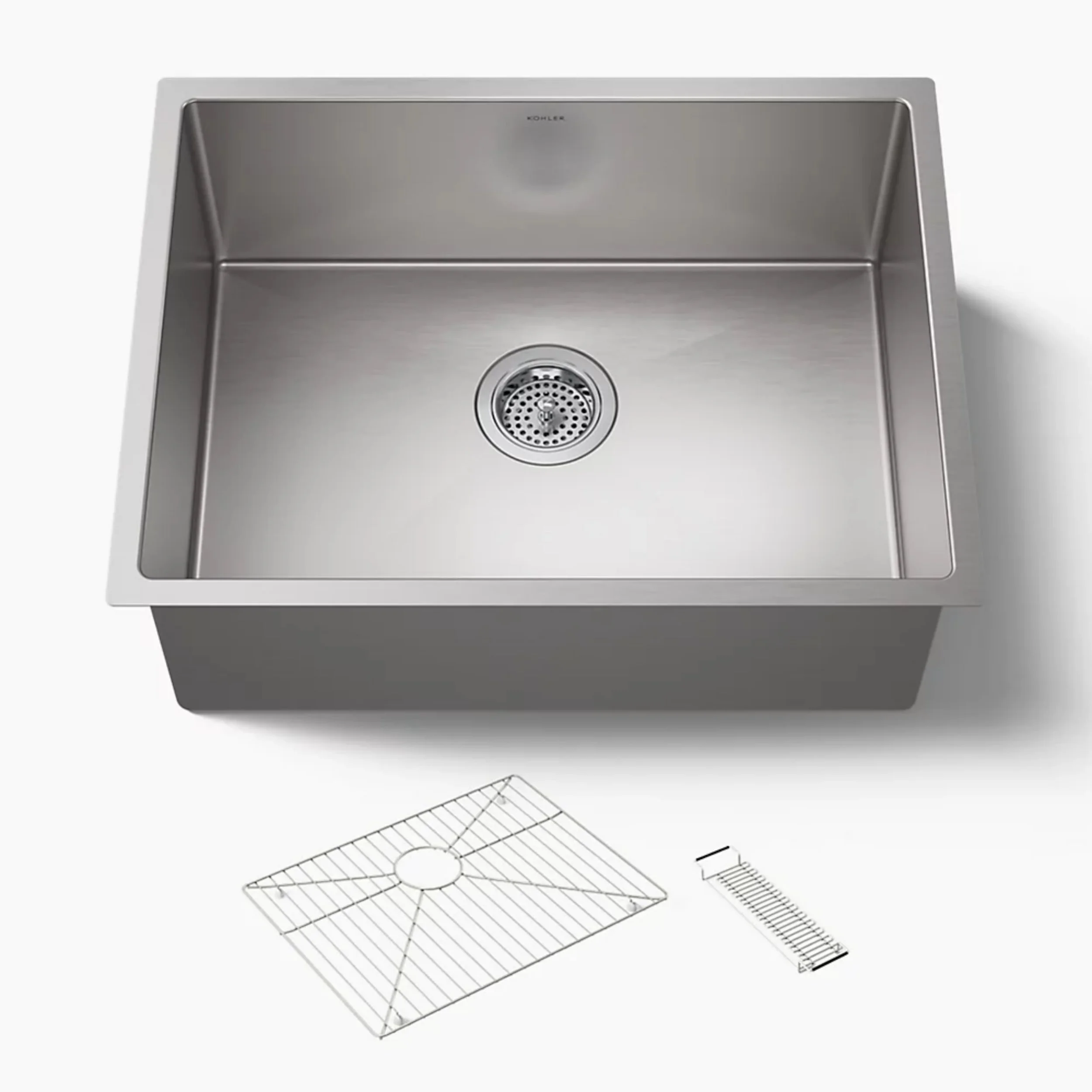 This KOHLER® Strive kitchen sink offers professional style with easy-to-clean curved corners. Made of thick, premium quality 16-gauge stainless steel, the medium-sized single bowl allows you to soak and clean large cookware and bakeware. Strive features a sound-absorption system that significantly reduces disposal and dishwashing noise. This undermount kitchen sink includes a bottom sink rack to help prevent scratches.